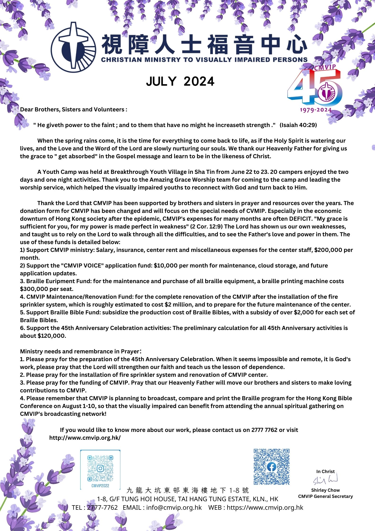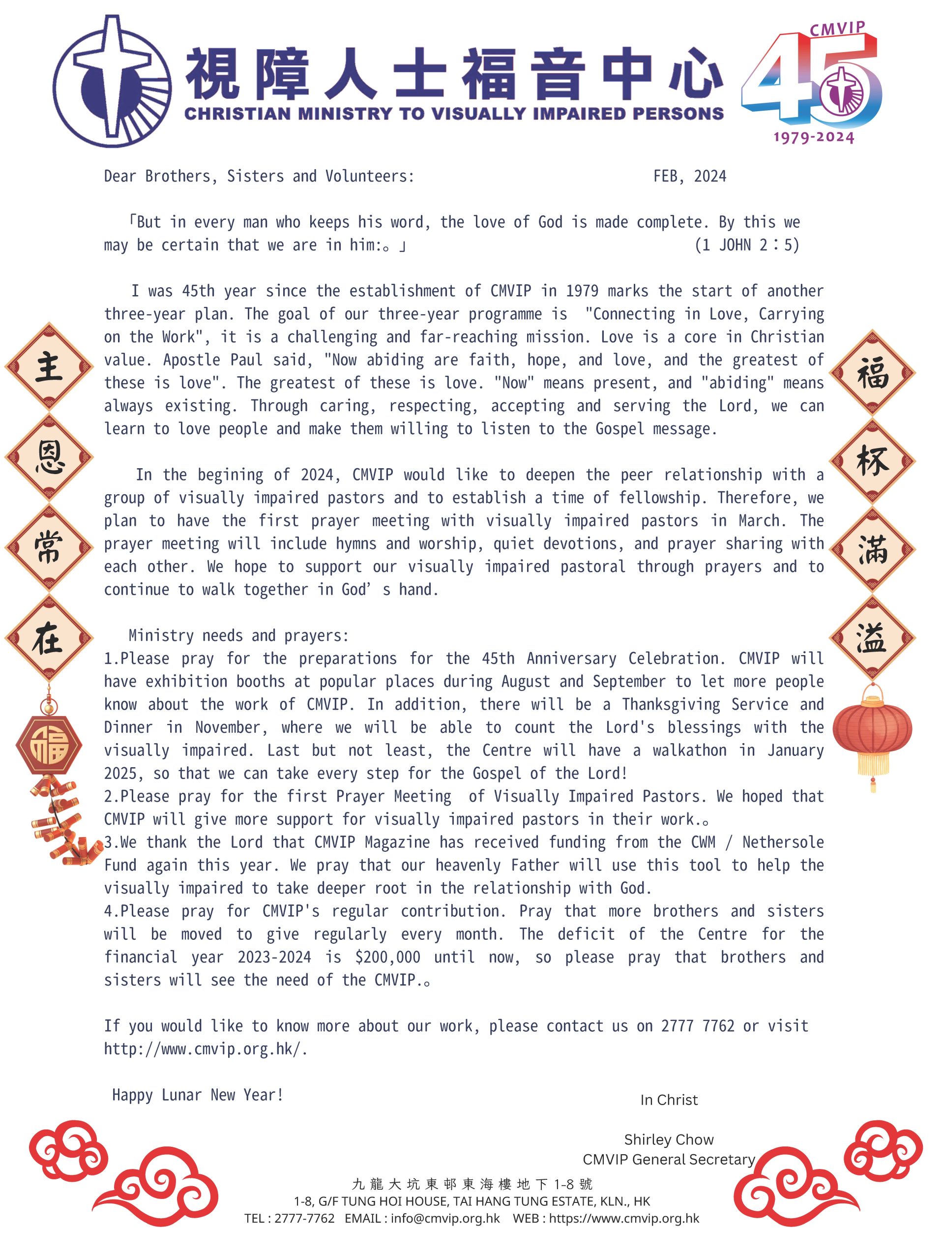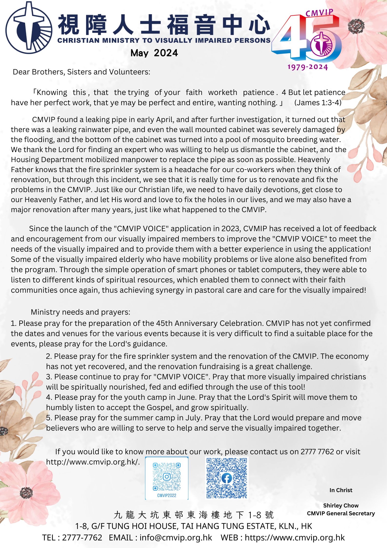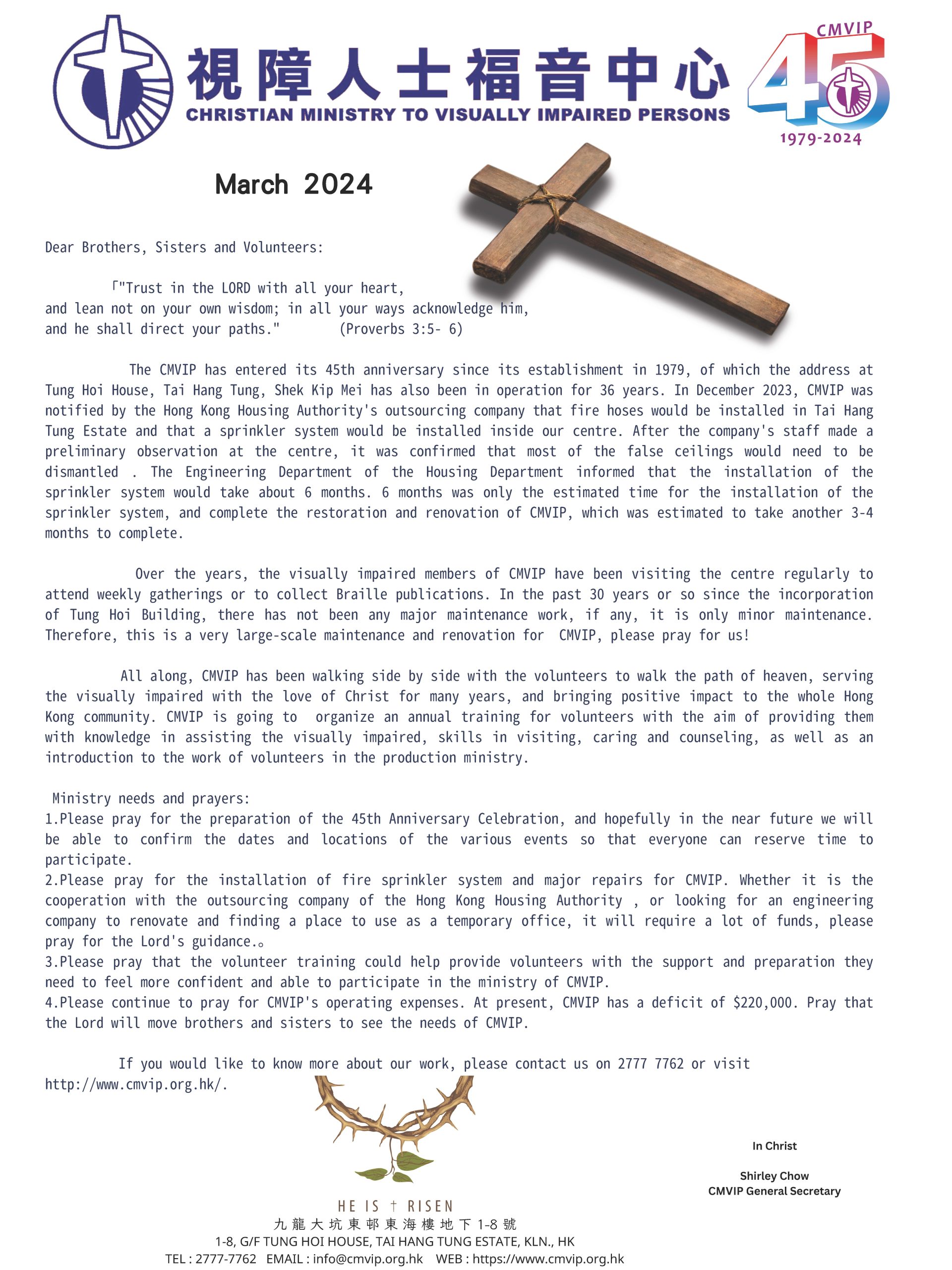 2 May May 2, 2024 MAY 2024 Newsletter Dear Brothers, Sisters and Volunteers: 「Knowing this , that the trying of your faith worketh patience . 4 But let patien... 閱讀更多
