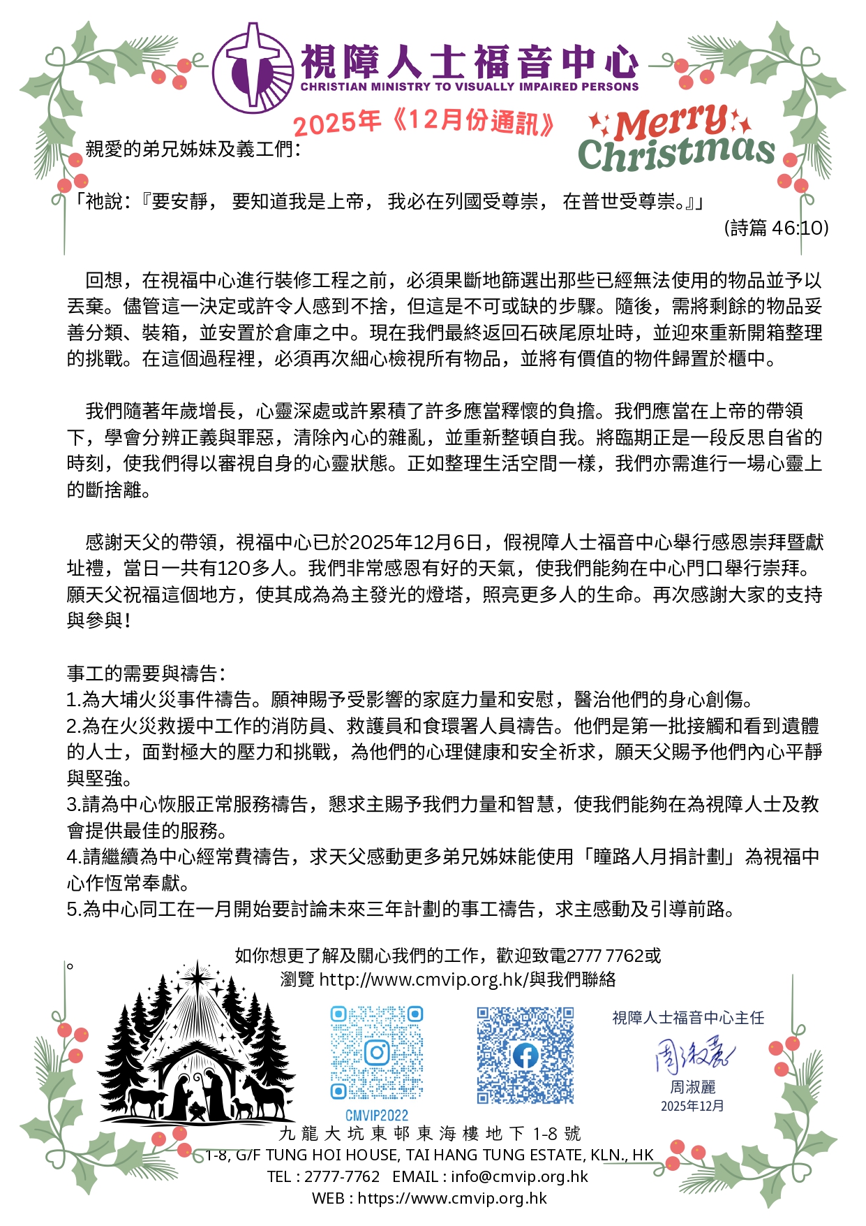 3.请为中心恢服正常服务祷告,恳求主赐予我们力量和智慧,使我们能够在为视障人士及教会提供最佳的服务。